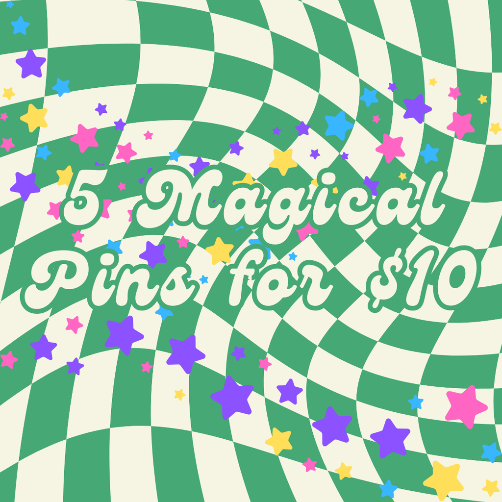 Can contain 5 of any full-size magical enamel pins I've created over the last 7 years. If buying more than one, I cannot guarantee that you won't get a duplicate.